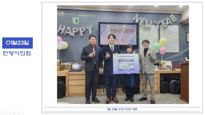 2025년 1월 23일 안양시의회 후원방문 페이지 정보 작성자 운영자 댓글 0건 조회 995회 작성일 25-01-29 13:50 본문 안양시의회에서 후원방문 해주셨습니다. 목록 이전글2025년 1월 20일 안양과천교육지원청 후원방문, 1월 일정 공지 25.01.29 다음글2025년 1월 22일 지디씨주식회사 후원방문 25.01.29 댓글목록 댓글목록 등록된 댓글이 없습니다.