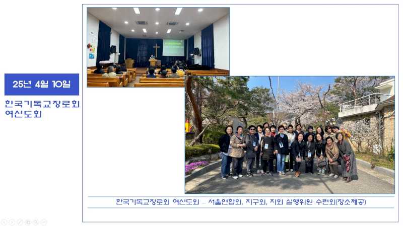 2025년 4월 10일 한국기독교장로회 여신도회 수련회(장소 제공) 페이지 정보 작성자 운영자 댓글 0건 조회 794회 작성일 25-04-15 15:45 본문 한국기독교장로회 여신도회 서울연합회, 지구회, 지회 실행위원 수련회를 안양의집에서 실시하였습니다.(장소 제공) 목록 이전글2025년 4월 15일 오인숙님 후원(롤휴지 40팩) 25.04.15 다음글2025년 4월 9일 새안양회 후원방문(치킨, 피자 등) 25.04.15 댓글목록 댓글목록 등록된 댓글이 없습니다.