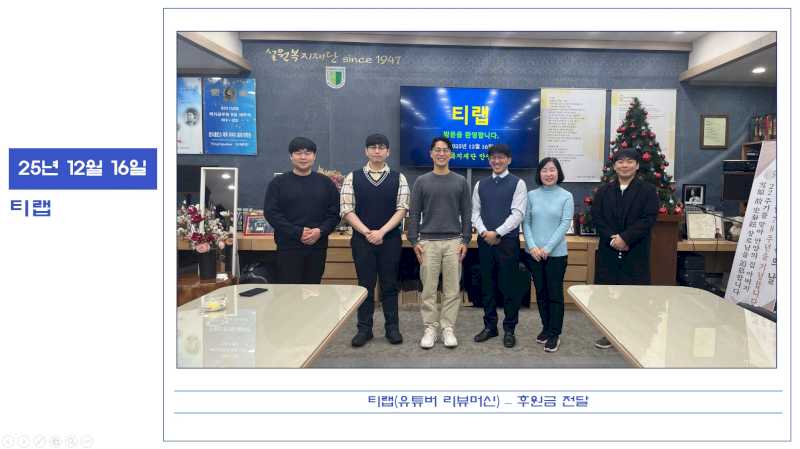 25년 12월 16일 티랩 후원금 전달 페이지 정보 작성자 운영자 댓글 0건 조회 145회 작성일 26-02-10 11:40 본문 티랩(유튜버 리뷰머신)에서 후원금 전달을 해주셨습니다. 감사합니다. 목록 이전글25년 12월 18일 삼천리성탄행사 26.02.10 다음글25년 12월 16일 삼천리 기부금 전달식(유현조 프로) 26.02.02 댓글목록 댓글목록 등록된 댓글이 없습니다.