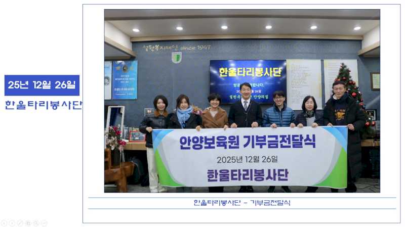 25년 12월 26일 한울타리봉사단 기부금전달식 페이지 정보 작성자 운영자 댓글 0건 조회 200회 작성일 26-02-10 13:29 본문 한울타리봉사단에서 방문하셔서 기부금을 전달해 주셨습니다. 감사합니다. 목록 이전글25년 12월 안양의집 송년식, 12월 일정공지 26.02.10 다음글25년 12월 24일 안양의집 성탄제 26.02.10 댓글목록 댓글목록 등록된 댓글이 없습니다.